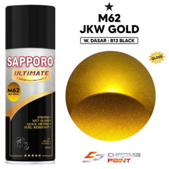 Sapporo Ultimate M62 JKW Gold Sapporo Ultimate M62 JKW Gold adalah cat semprot warna emas dengan tone lebih kuning dan hasil akhir metallic glossy. Warna ini cocok untuk berbagai aplikasi seperti velg, body motor, aksesoris kendaraan, hingga dekorasi agar tampil lebih mewah dan elegan. Keunggulan Sapporo Ultimate M62 JKW Gold: – Warna emas lebih cerah…