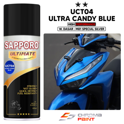 Sapporo Ultimate UCT04 Ultra Candy Blue adalah cat semprot dengan efek candytone yang menghasilkan tampilan seperti permen, elegan, dan mewah. Formulasi Ultra Candytone memiliki daya tahan 6x lebih kuat dibanding candytone biasa dan hasil akhir metallic + glossy yang tahan bensin. Cocok untuk kendaraan, motor custom, dan proyek pengecatan lainnya.