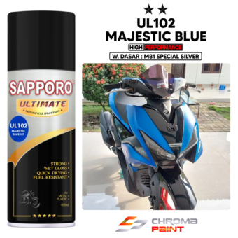 Sapporo Ultimate UL 102 Majestic Blue Sapporo Ultimate UL 102 Majestic Blue HP adalah cat semprot warna biru metalik dengan butiran diamond yang menghasilkan efek semi chrome. Dengan high performance formula, warna ini 6x lebih kuat dibandingkan cat metalik biasa dan cocok untuk body motor, velg, serta helm yang sering terpapar sinar matahari. Keunggulan Sapporo…