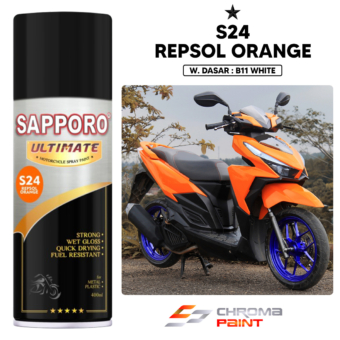 Sapporo Ultimate S24 Repsol Orange Sapporo Ultimate S24 Repsol Orange adalah cat semprot berkualitas tinggi dengan warna oranye solid yang cerah dan glossy, terinspirasi dari warna khas Repsol Orange. Dengan nozzle adjustable, semprotan bisa diatur vertikal atau horizontal seperti cat kompresor. Cat ini memiliki ketahanan lebih baik dibandingkan Sapporo 300cc, lebih keras, tahan lama, dan…