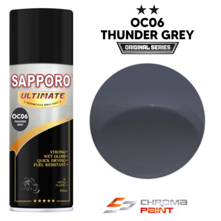 Sapporo Ultimate OC06 Thunder Grey adalah cat semprot aerosol premium dengan warna abu-abu metalik eksklusif, memiliki tingkat kemiripan lebih dari 95% dengan warna Mini Cooper Thunder Grey. Cocok untuk pengecatan ulang mobil, motor, dan proyek DIY dengan hasil akhir glossy yang mewah.